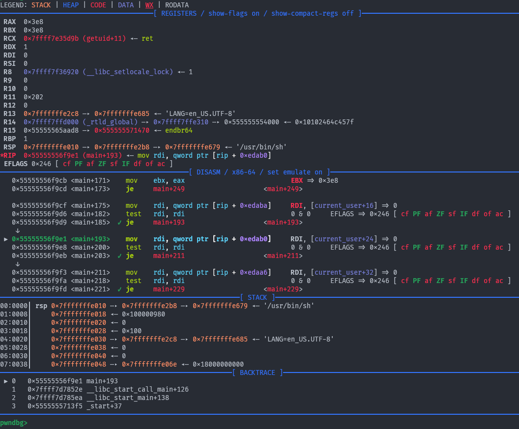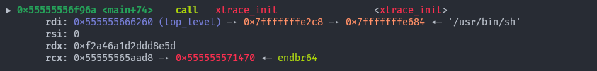 A useful summary of the current execution context is printed every time the debugger stops (e.g. breakpoint or single-step), displaying all registers, the stack, call frames, disassembly, and additionally recursively dereferencing all pointers. All memory addresses are color-coded to the type of memory they represent.