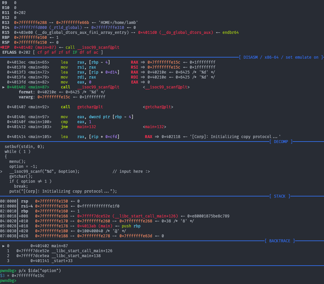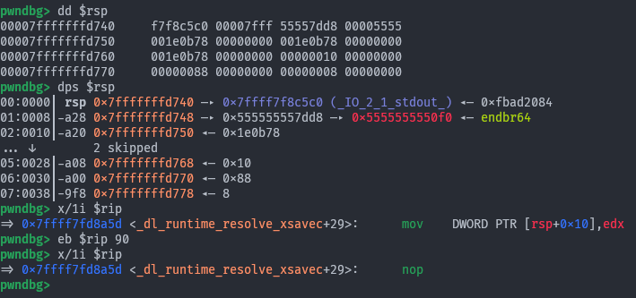 For those coming from a Windows background, Pwndbg has a complete WinDbg compatibility layer. You can dd, dps, eq, and even eb $rip 90 to your heart's content.