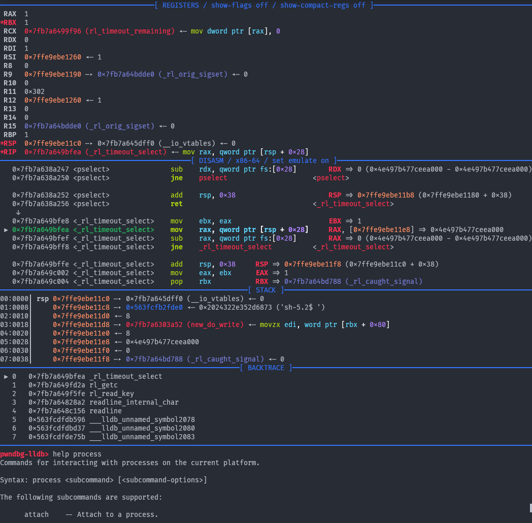 Pwndbg has a great deal of useful features. You can a see all available commands at any time by typing the pwndbg command or by checking the Commands section of the documentation. For configuration and theming see the Configuration section. Below is a subset of commands which are easy to capture in screenshots.