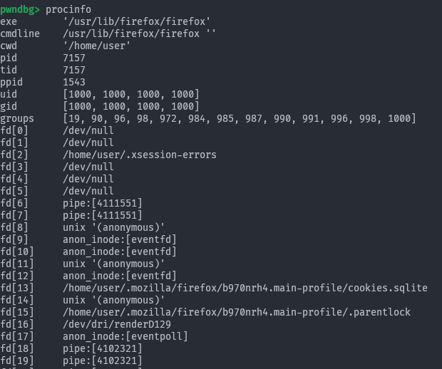 Use the procinfo command in order to inspect the current process state, like UID, GID, Groups, SELinux context, and open file descriptors! Pwndbg works particularly well with remote GDB debugging like with Android phones.