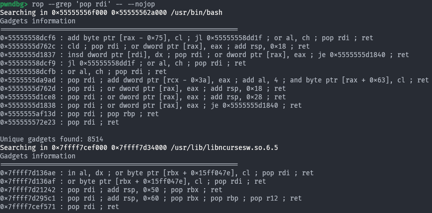 Pwndbg makes searching the target memory space easy, with a complete and easy-to-use interface. Whether you're searching for bytes, strings, or various sizes of integer values or pointers, it's a simple command away.