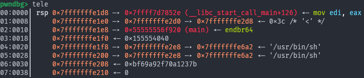 Inspecting memory dumps is easy with the telescope command. It recursively dereferences a range of memory, letting you see everything at once. As an added bonus, Pwndbg checks all of the available registers to see if they point into the memory range.
