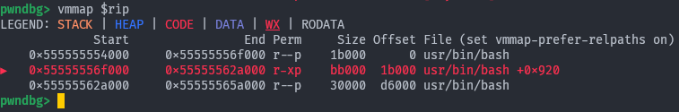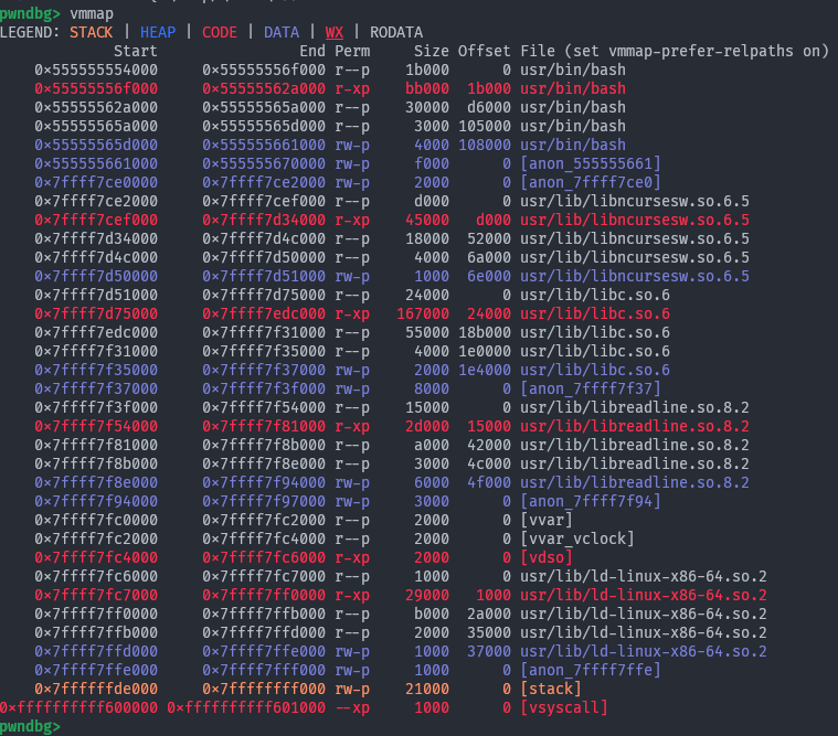Pwndbg enhances the standard memory map listing and allows easy searching with vmmap.